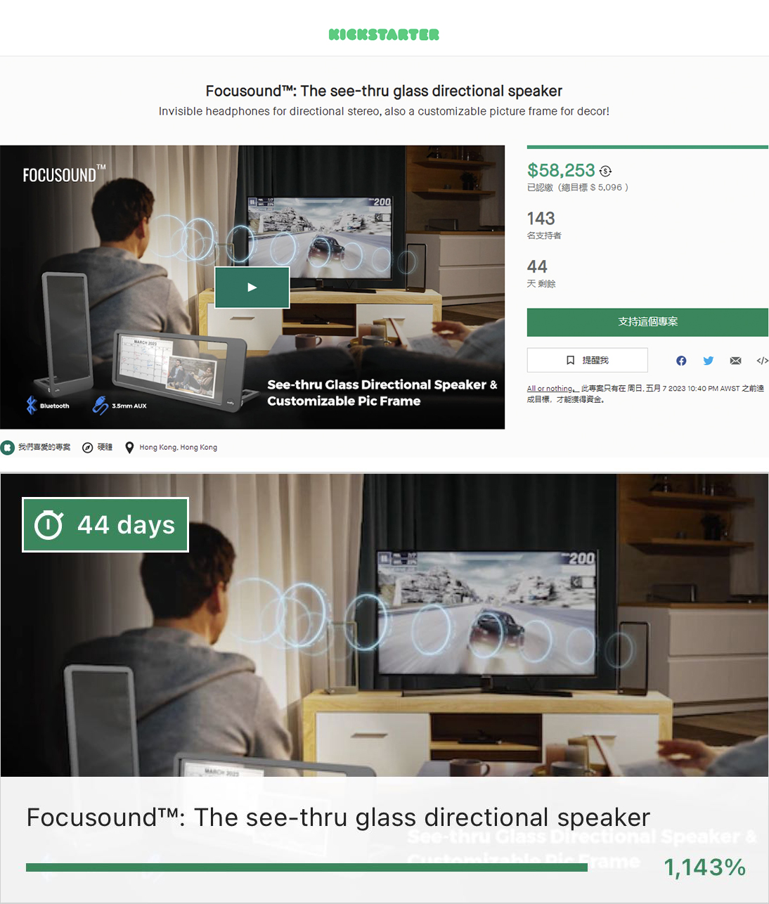 3月23日,美國東部時間11點(北京時間3月23日23點),清聽聲學聚音屏Focusound Screen ®全透明屏幕定向發聲音箱正式在美國Kickstarter開放眾籌。根據ks眾籌頁面數據顯示,這款定向音箱目前已有143名支持者,上線1小時已達成目標金額,10小時眾籌完成率高達1143%,遠超預期的眾籌目標(數據截止發稿前)。
