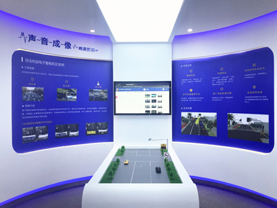 通過觸摸屏播放視頻講解聚音寶,以模型展現智慧文體產品型號,觸摸屏展示其應用案例。在鳴笛抓拍系統展區,采用微縮道路模型+顯示屏,還原應用現場。通過觸摸屏介紹驅逐者系統及其行業應用。