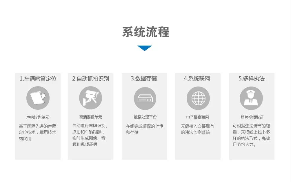捕捉鳴笛聲---定位車輛---車牌識別---圖片視頻拍攝---證據上傳---聯網警務系統,整個過程耗時不超過3秒。