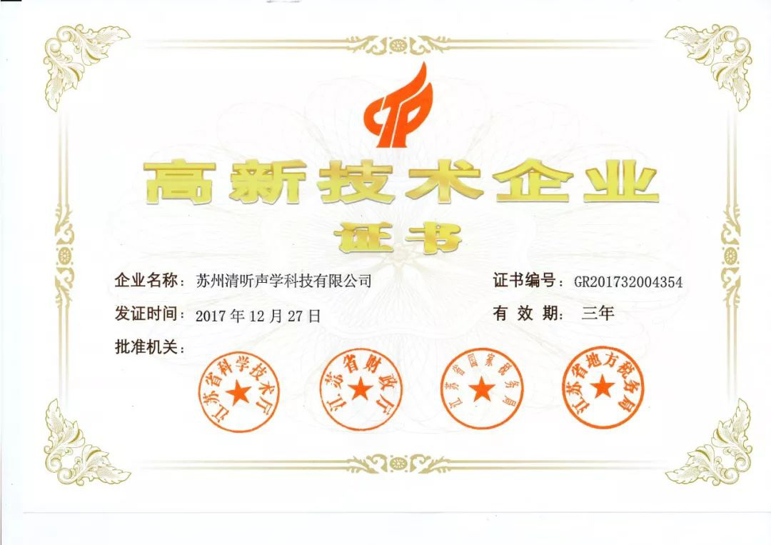 2017年12月27日,高企認(rèn)定官網(wǎng)上公示了江蘇省第三批擬認(rèn)定高新技術(shù)企業(yè)名單,清聽聲學(xué)榜上有名。
