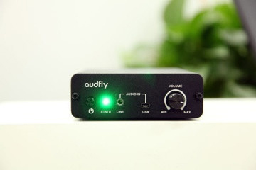 功放盒子,采用金屬機(jī)身,配合黑色噴砂陽極氧化工藝,品質(zhì)感十足,前面有電源鍵、指示燈、Audio in接口(音頻線和USB數(shù)據(jù)線均可接入)、音量旋鈕;后面是電源接口和Audio輸出接口;底部四個(gè)角各有1個(gè)防滑硅膠墊。
